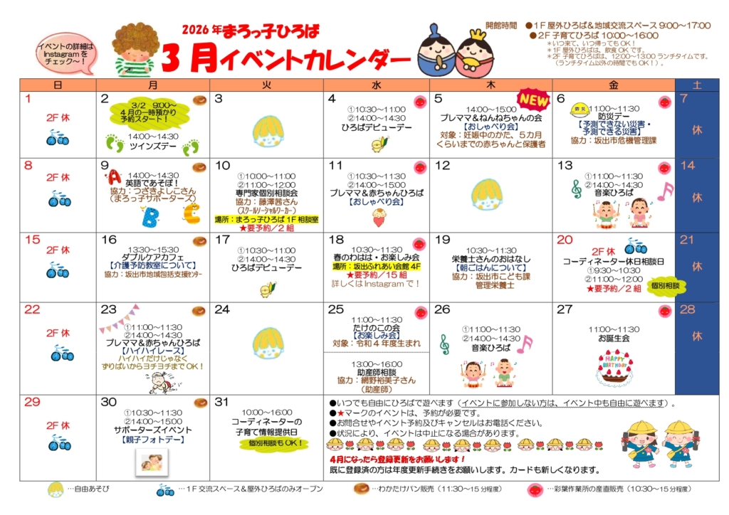 さぬきこどもの国、はぐはぐランドうたづ、神愛館、あそvivaぶんぶん、国分寺支所、国分寺図書館、新居東児童館、新名柏原児童館、国分児童館、イオン坂出店、イオンタウン宇多津、ハローズ林田店、ユープラザ宇多津、スーパーセンター宇多津、ビッグ国分寺など(順不同)